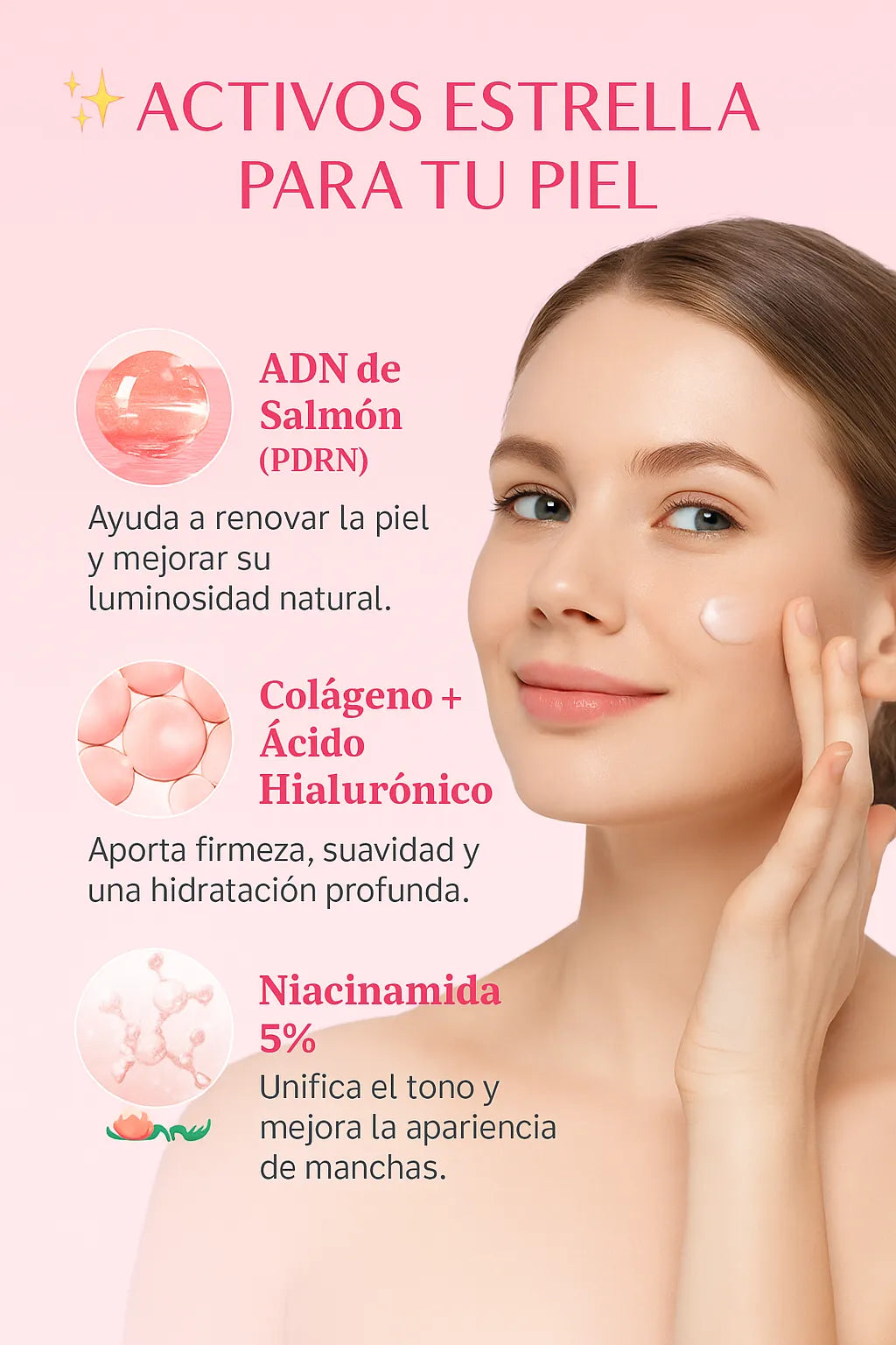 🌟 Devuelve la luminosidad perdida. El ADN de salmón PDRN ayuda a regenerar la piel desde dentro, haciendo que se vea menos apagada y con un brillo saludable, no grasoso.